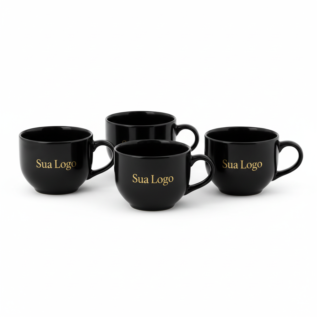 Kit com 4 xícaras de café em porcelana preta, com capacidade de 95ml, ideal para espresso/cafezinho. Personalização com logo da sua empresa, perfeito para brindes, eventos, cafeterias e uso corporativo.